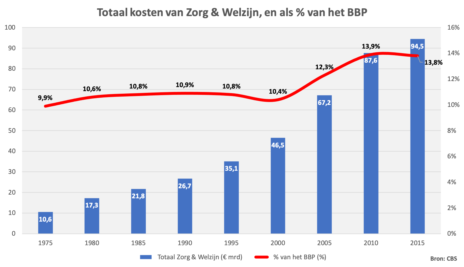 In 2009 waren de uitgaven aan de zorg, gezondheids- en welzijnszorg tezamen, 83,8 miljard euro. Dit is 5,8% meer dan in 2008. In de periode 2004-2008 zijn de uitgaven aan zorg steeds harder gaan groeien. Het aandeel van de zorguitgaven in het BBP is in 2009 gestegen tot 14,7% (was 13,3% in 2008). Deze forse stijging is het gevolg van een sterke daling van het BBP (-4,0%) door de recessie gecombineerd met een voortgaande groei van de zorguitgaven.