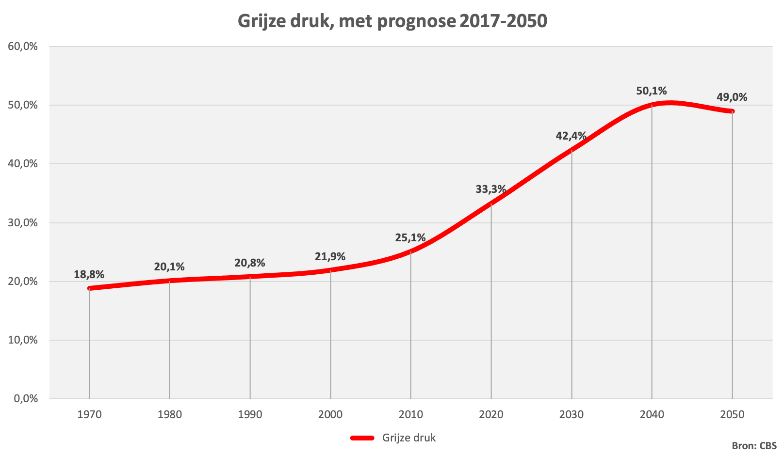 De grijze druk geeft inzicht in de verhouding ouderen tot het potentieel werkende deel van de bevolking, dat de lasten van de vergrijzing moet opvangen. In 2018 is de grijze druk 30%, wat betekent dat er 30 65-plussers waren per 100 potentiële arbeidskrachten (20-64-jarigen). Tot aan 2039 zal de grijze druk sterk toenemen tot ca. 50%; per 65-plusser zijn er twee potentiële arbeidskrachten.