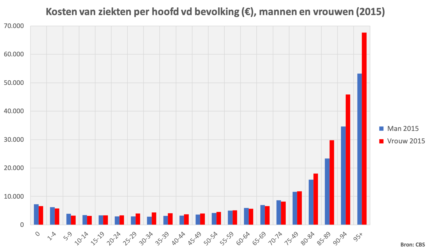 Van de totale kosten aan zorg in 2005 werd 37,5% besteed aan de bevolking ouder dan 65 jaar (25,7 miljard euro). Volgens de CBS Bevolkingsprognose zal het aantal 65-plussers toenemen van 2,6 miljoen in 2011 tot een hoogtepunt van 4,6 miljoen in 2039 (een toename met ruim 75%), met een stijging van de totale zorgkosten tot gevolg.